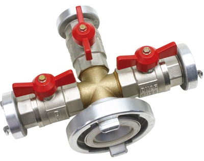 Verdeelstuk met kogelaflsuiters met 1 x Storz C nok 66 en 3 x Storz D nok 31.