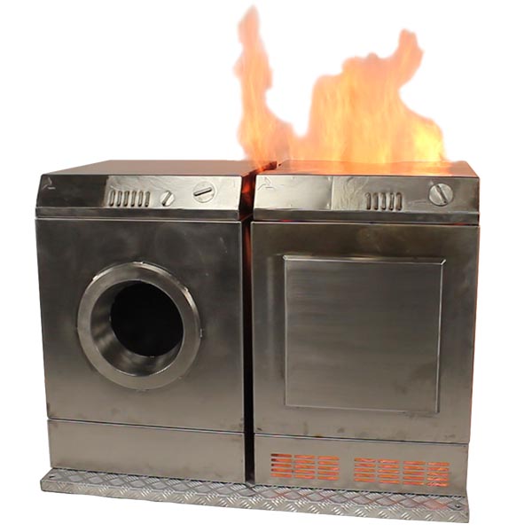 De Add-on Was-droogcombinatie vormt een onderdeel van een levensechte brand in een wasruimte. De Vesta is volledig weg te werken in de droger en is daardoor niet zichtbaar.